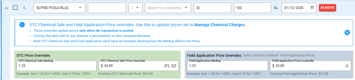 When entering an addition, if you change the unit cost of the chemical, a menu will expand allowing you to also adjust the price for your Over the Counter sales and your Field Application Invoices! This will automatically allow you to update the chemical unit cost and chemical prices. It also allows you to use a markup tool!